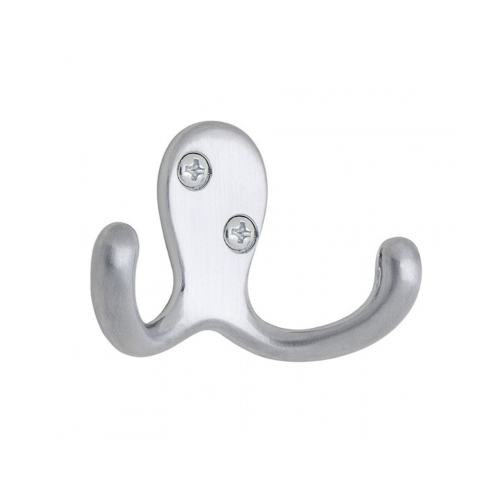 Stijlvolle haak met twee hangers. Past mooi in badkamer, keuken en gang. Verkrijgbaar in vier verschillende uitvoeringen – gepolijst messing, chroom, geborsteld chroom en matzwart.