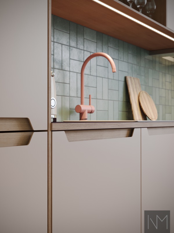 Gemaakt van HDF bedekt met eikenfineer en linoleum, zijn de Linoleum Elegance-fronten ultramat, robuust en duurzaam met een dikte van 21 mm. De ruitvormige greep van massief eikenhout zorgt voor zowel stijl als ergonomische functionaliteit, wat een vleugje elegantie aan elke keuken toevoegt.